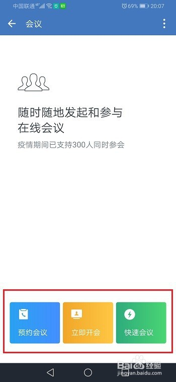 第二步进去会议界面之后,可以看到有三种会议可以选择,预约会议,当即开会,快速会议,如下图所示: