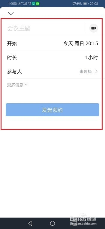 第五步我们也可以选择预约会议,设置会议本家儿题,时候,加入会议的人等,到了时候,进行开视频会议,如下图所示: