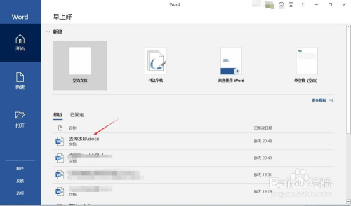 启动Word后在起头页面右侧的比来下面找到需要进行去水印的文档点击打开,若是没有显示在比来文件列表,可以点击打开、浏览找到需要编纂的文件进行打开。