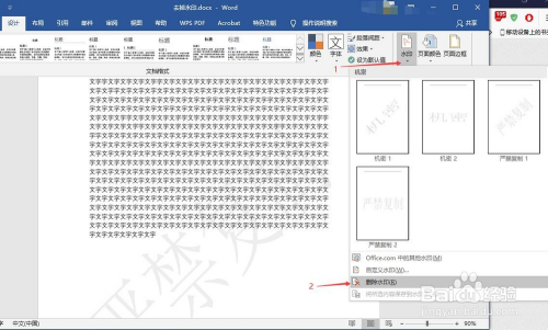 点击设计东西栏右侧水印文字下面下三角符号,在弹出的菜单中点击“删除水印”即可删除文档中的水印。