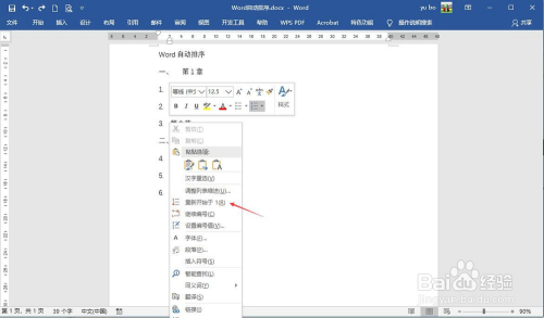 这时我们注重到第2章的二级目次编号是继续第1章里的编号的,需要在第1序号处点击右键,在弹出菜单中选择“从头起头于1”来实现从头编号。