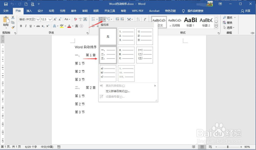 点击段落东西栏上面的编号右边的小三角符号,在弹出菜单中点击需要选择的序号类型。