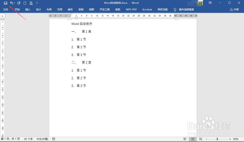 打开文档后,选择需要主动排序的文字,本示例选择“第1章”和“第2章”(按住Ctrl键实现选择多个区域),选定后用鼠标点击Word的“起头”菜单。