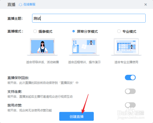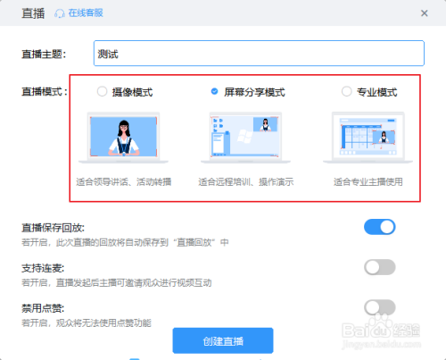 直播模式的选择,有三种模式可以选择,屏幕分享模式是比力常用的,适合培训讲授等,可以让学员看到本身的电脑屏幕。这里我就选择“屏幕分享模式”