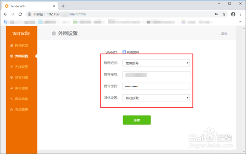 然后选择联网体例为“宽带拨号”,接着输入宽带账号和密码,点击毗连