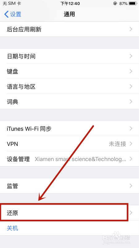 【通用】菜单栏,找到【还原】选项。