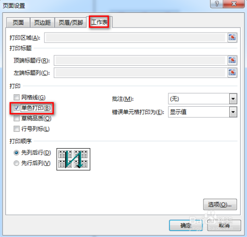 在弹出的对话框中,点击“工作表”选项卡,找到“打印”,并勾选“单色打印”,最后点击“确定”,具体如下图所示:
