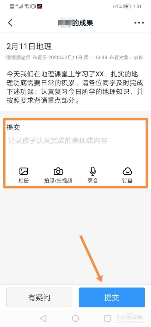 在“提交”一栏,我们可以经由过程文字、图片、语音等体例上传功课,然后点击“提交”。
