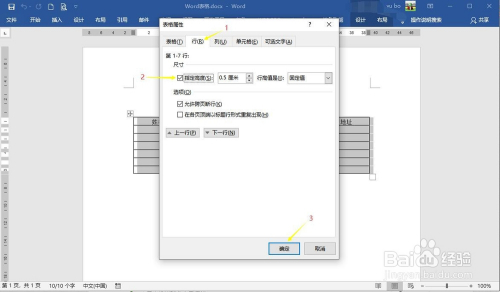 在表格属性对话框,点击“行”,然后勾选尺寸下在的“指定高度”,并在后面的值中输入值(单元是厘米),该方式可以调整整个表格所有行的行距。
