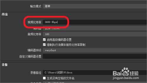 进入输出设置界面后,点击【视频比特率】旁边的输入框将视频比特率设置为【3600以上】(理论上该值越高越好)