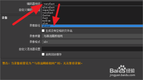 然后再找到下方的【编码器预设】设置,将其设置为【slower】