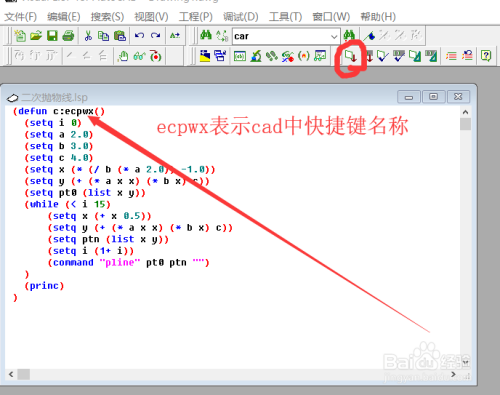 假设二次抛物线函数为y=ax^2+bx+c,示例函数取值a=2,b=3,c=4,每一个点x增量为0.5,i值暗示轮回次数,i取值为小于15的0-14之间的次数,暗示辅助线总共画了15条,按照需要可自行更改,然后将函数加载到cad。