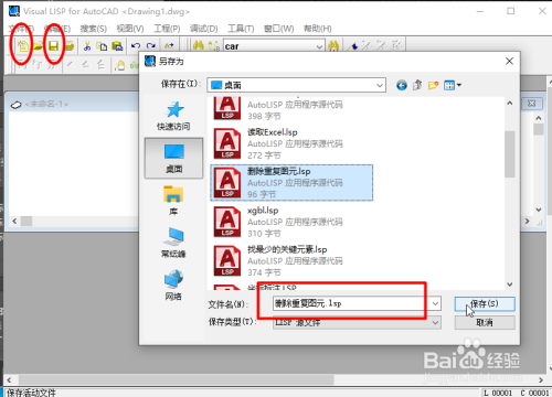 在Lisp编纂器中点击新建,再点击保留,保留为Lisp源文件,定名为“删除反复图元”,点击保留,如图所示。