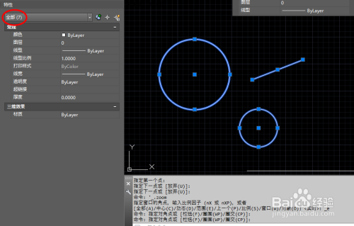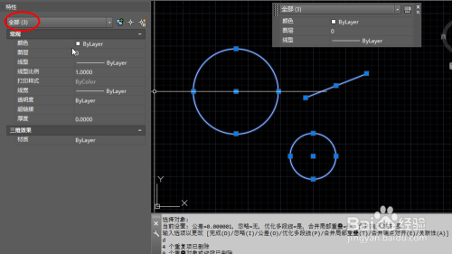 关失落编纂器窗口,再CAD自行画几个图形,我们看到的图形界面只有两个圆,一条线段,但选中后显示有七个对象,这是因为有反复图元,如图所示。
