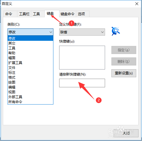 主动弹出的自界说窗口,点击键盘,在类别出可以找到您想要点窜的号令,在其右边“请输入新快捷键(N)”框中加上本身想要的快捷键即可。