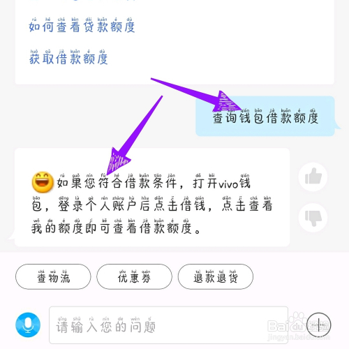 第四步,在输入问题中,输入“查询贷条目额度”,获得查询贷条目额度的教程。