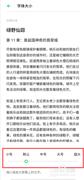 进行调整界面,滑动选择字体大小,可以选择本身想要的字体大小,如“小号”、“默认”、大号等等,缩小或放大屏幕上的字体。