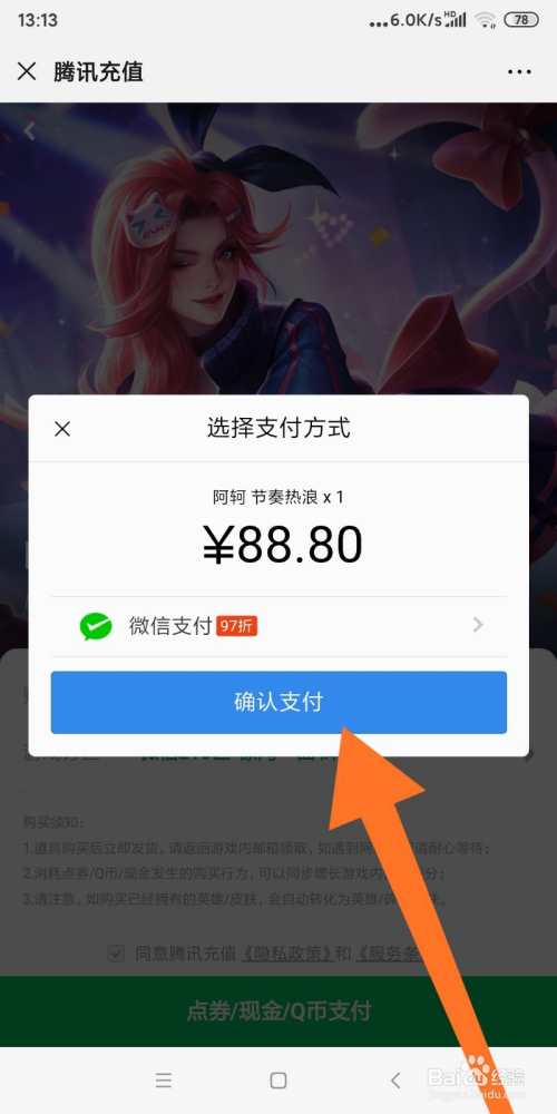 14.如图所示,在弹出的选择支付体例对话框中,我们点击箭头所指的“确认支付”按钮。