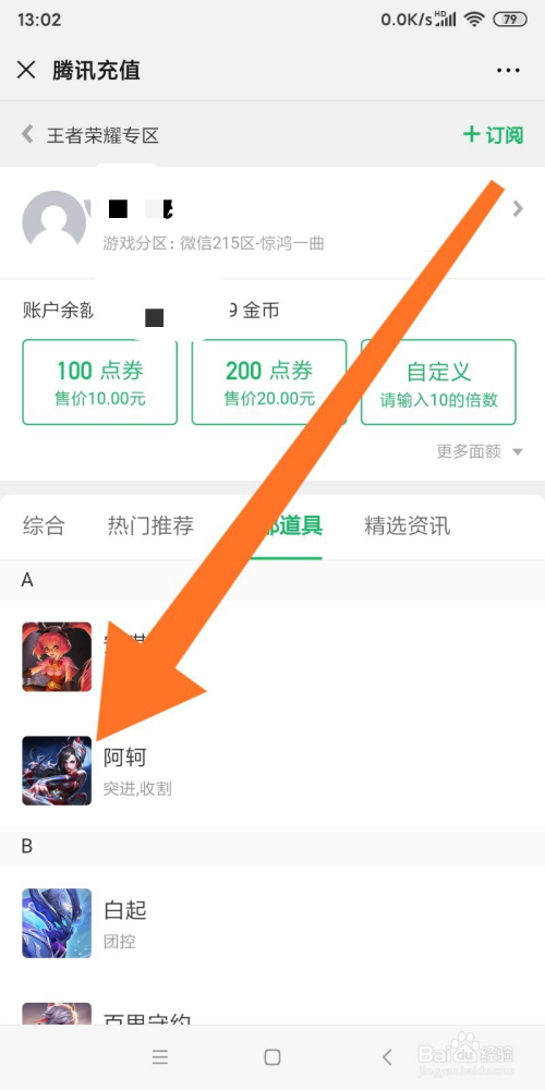 10.如图所示,在这个全数道具选项下,我们点击箭头所指的“阿珂”这个英雄的图标(这里以采办阿珂这个英雄为演示对象,大师可以按照本身的需要采办英雄。)。