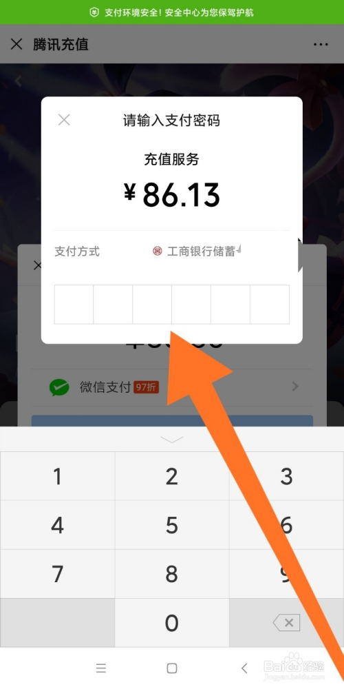 15.如图所示,在弹出的请输入支付密码对话框中,我们在箭头所指的6个输入方框中,我们输入我们的6位支付密码,就可以采办这个英雄皮肤当作功了。