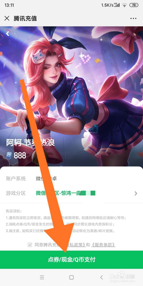 12.如图所示,在这个页面中,我们点击箭头所指的“点卷/现金/Q币支付”按钮。