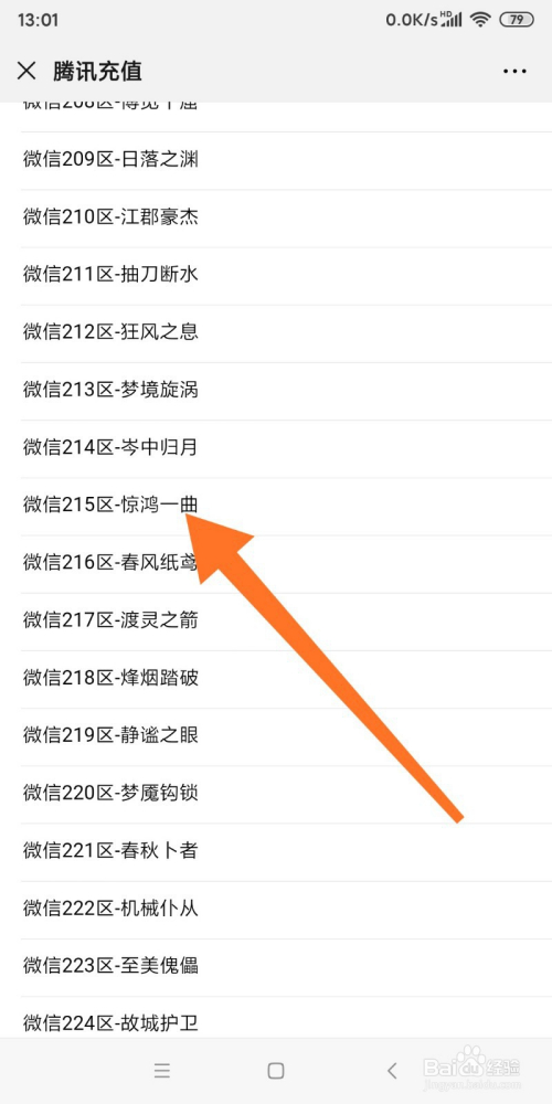 8.如图所示,在这么多的分区中,我们点选箭头所指的“微信215区-惊鸿一曲”这个区(这里以充值这个区作为展示,大师可以选择本身正在玩的区。)。
