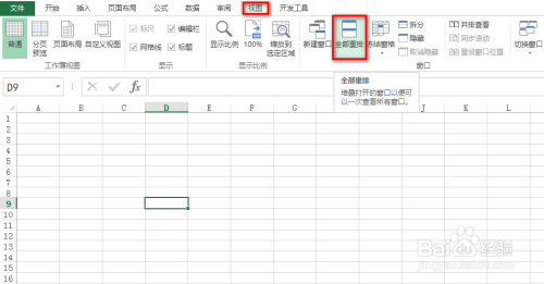 在“视图”选项卡下找到并点击“全数重排”,具体如下图所示: