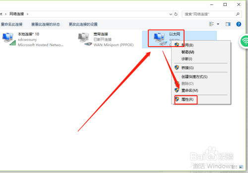 在新弹出窗口中找到“以太网”,并在其上右键,点击“属性”。