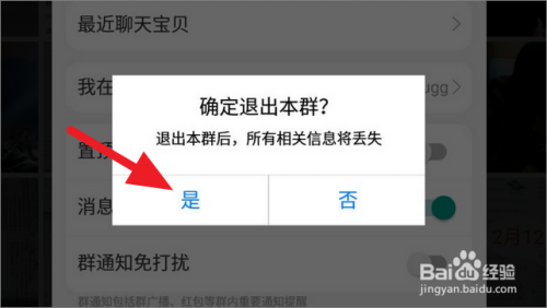 然后会弹出确认退出的窗口,点击【是】按钮即可退出该群聊