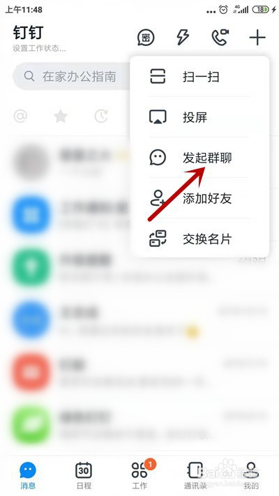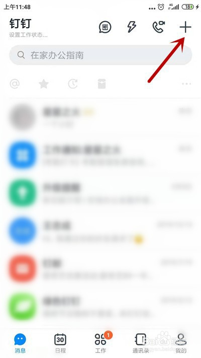 1.首先,在钉钉首页点击右上角【+】选项。