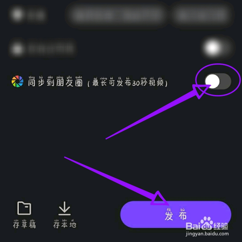 第五步,在发布界面将同步到朋友圈后的按钮打开,点击“发布”即可。