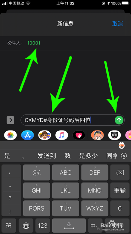 打开新动静界面,在收件人处填写“10001”,然后编纂短信“CXMYD#身份证号码后四位”,接着点击“发送”图标。