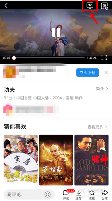 找到方针片子后点击起头播放,然后在播放界面右上角的电视图标。