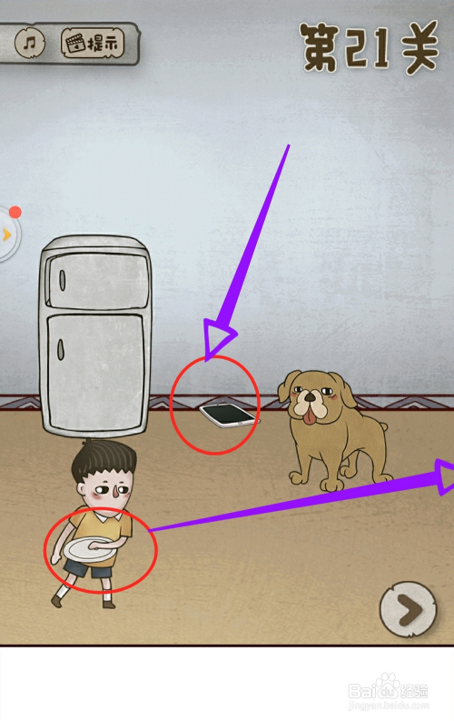 第21关,拿出地上的碟子标的目的右扔,狗狗走了就可以拿到游戏机。