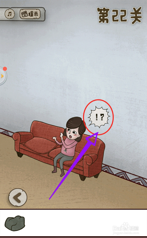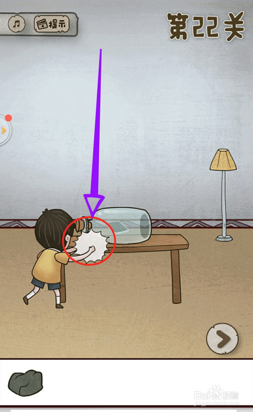 第22关,将地上的石头和蚊子捡起,将蚊子放到妈妈身上,然后呈现这个感慨号,拿这个白色的锯子去锯开瓶子就可拿到游戏机。