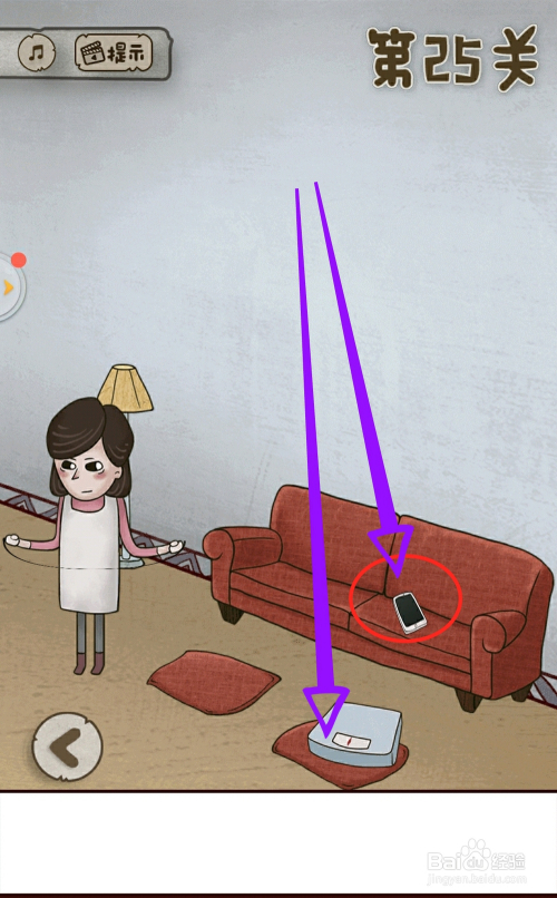 第25关,用扫把打扫体重秤放到妈妈面前,让妈妈称重,然后她就会去跳绳,拿开坐垫,拿到游戏机。