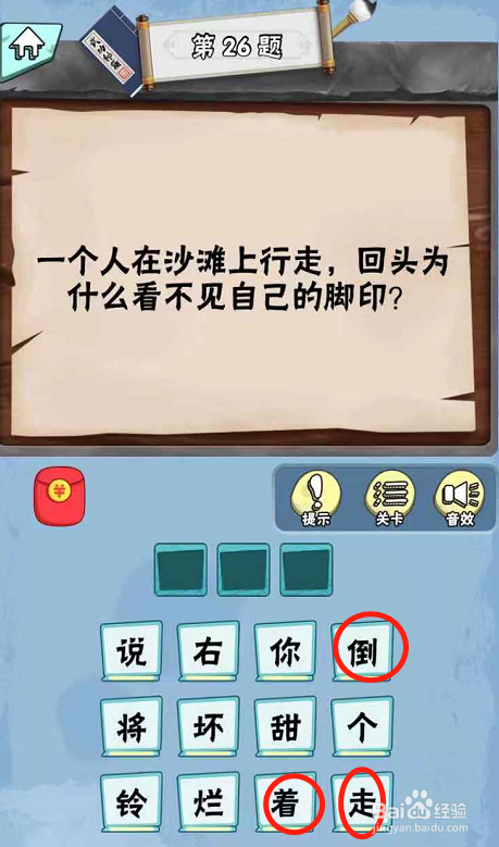 在第二十六关内,提问当一小我在沙岸上行走的时辰,回头为什么看不见本身的脚印。
