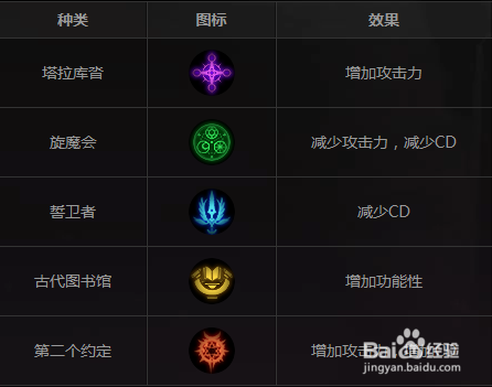 符文有5种类型,塔拉库沓、旋魔会、誓卫者、第二个商定、古代藏书楼。