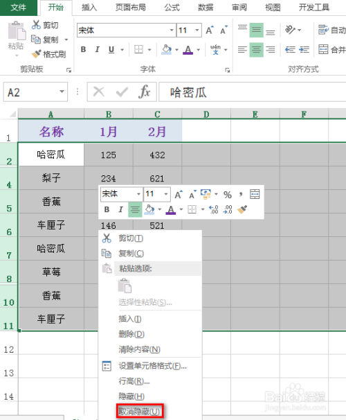 利用鼠标选中第2行,然后下拉选中下面所有的行,接着鼠标右键,在呈现的下拉菜单中,选择”打消埋没“,具体如下图所示: