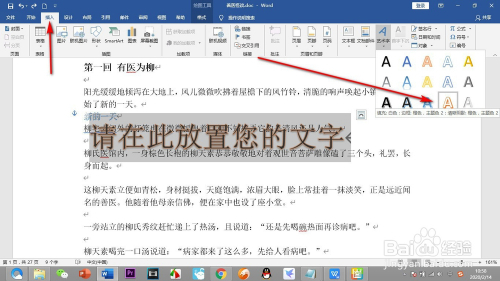 1.我们首先点击插入选项,然后点击右侧的艺术字按钮,之后选择一种文字模板。
