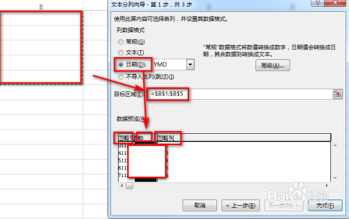 在新呈现的界面中,选中第1部门,然后选择“不导入此列”,接着选中第3部门,然后选择“不导入此列”,再选中第2部门,选择“日期”,接着将“方针区域”设置到待显示单位格区域,最后点击“完当作”,具体如下图所示: