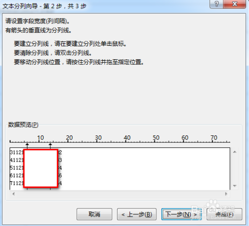 在新呈现的界面中,利用鼠标调动标尺,将出生日期离隔,形当作1、2、3共3部门,接着点击“下一步”,具体如下图所示: