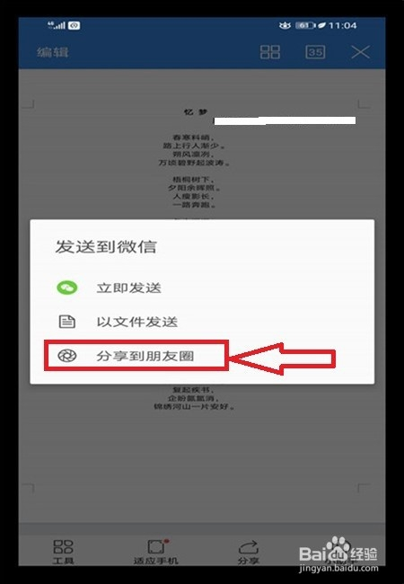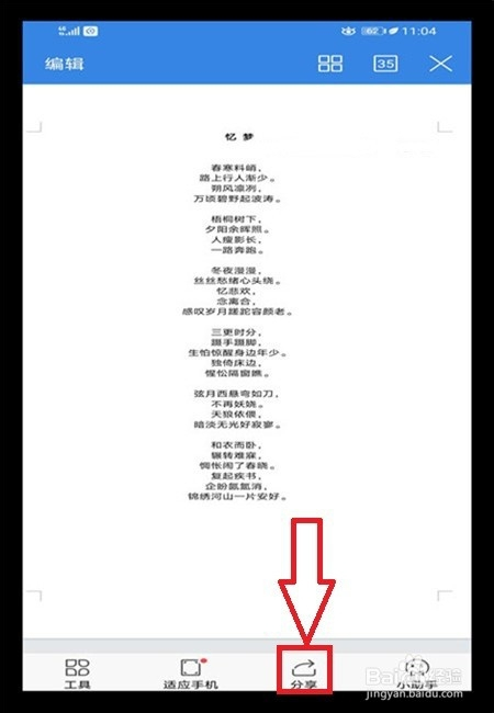 若是打不开文档,申明手机上没有安装打开的软件,打开文档后,鄙人方有一个【分享】,点击一下。