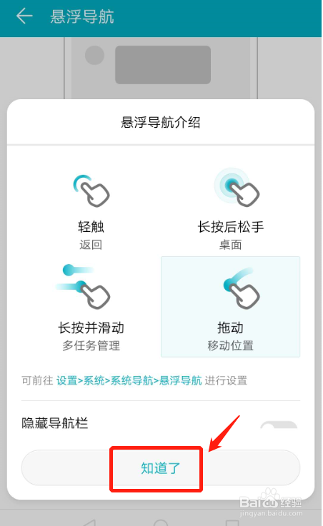 悬浮导航开启后,页面会呈现悬浮导航的功能介绍,当真阅读,然后点击“知道了”,虚拟悬浮键就设置完当作了。