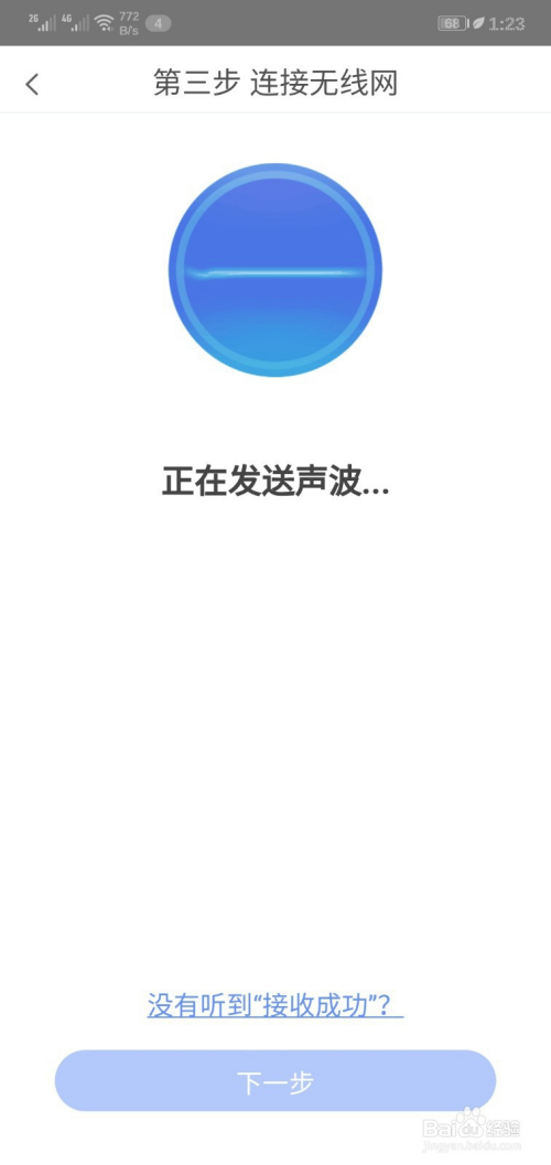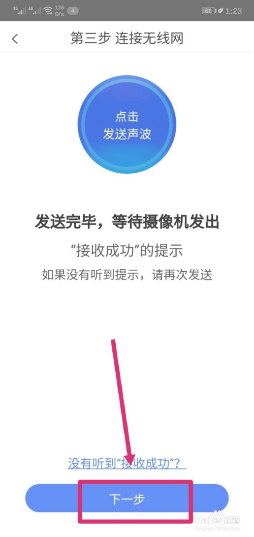 第十一步,按照提醒将手机调大音量并接近摄像头,然后点击【点击发送声波】。