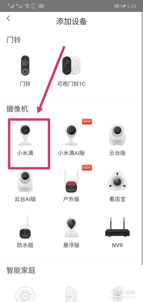第七布,添加设备,选择摄像机的型号,这里选择【小水滴】。