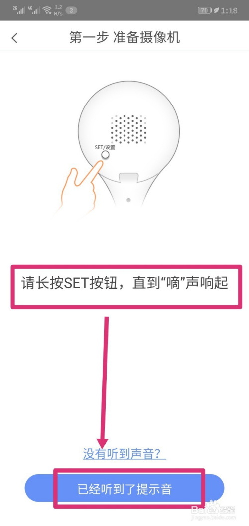 8、长按住摄像机的SET按钮,听到“嘀”声后,点击【已经听到了提醒音】。