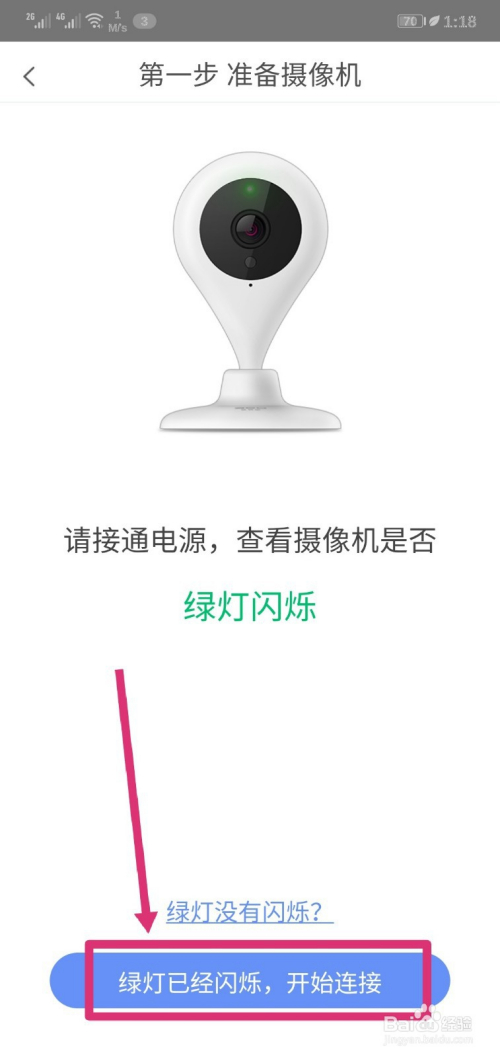 第八步,给摄像机接通电源,查看摄像头是否绿灯闪灼,绿灯闪灼了今后点击【绿灯已经闪灼,起头毗连】。