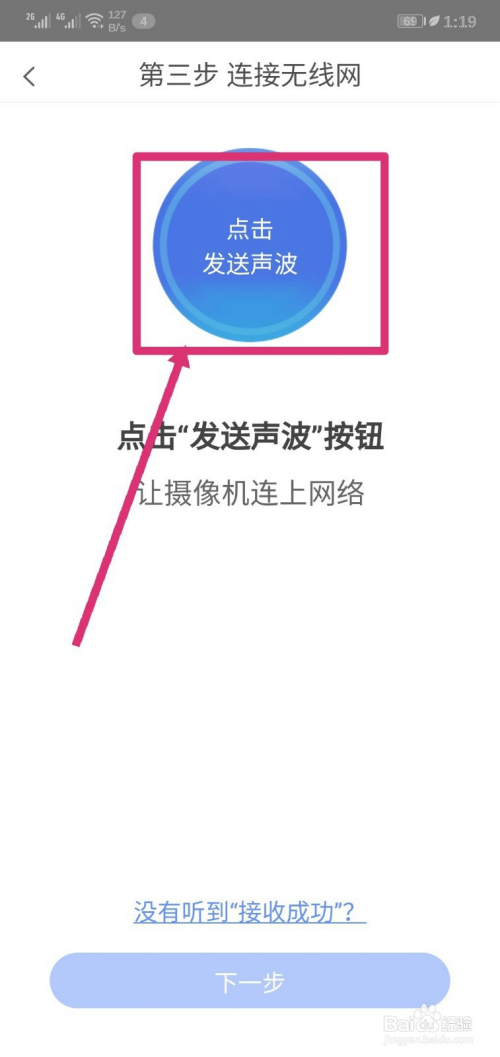 10、按照提醒将手机调大音量并接近摄像头,然后点击【点击发送声波】。