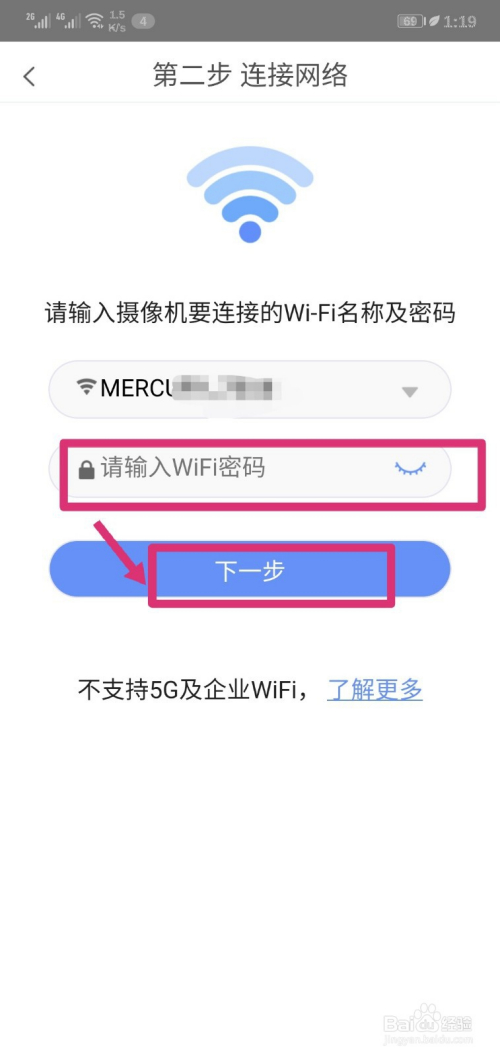 第十步,在手机上选择摄像机毗连的wifi,输入wifi密码,点击【下一步】。